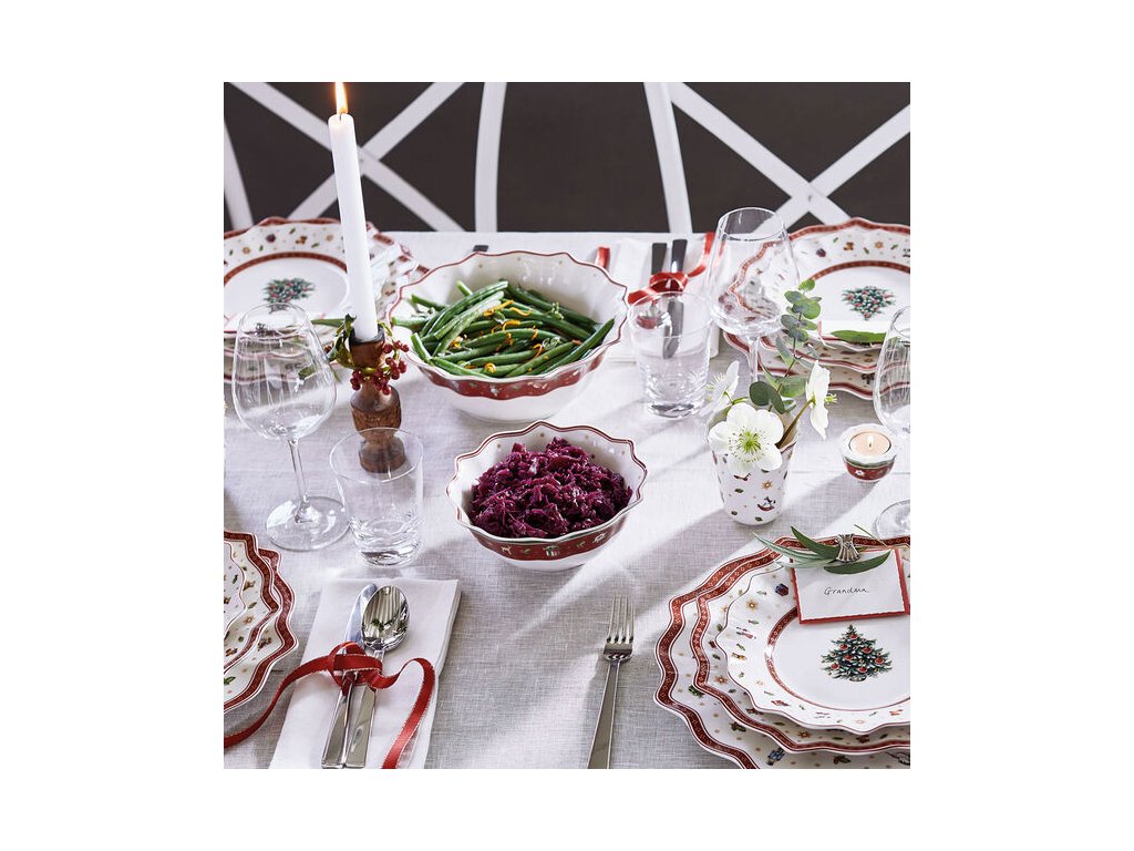 Colecția Toy's Delight de la compania germană Villeroy&Boch este esența Crăciunului și a atmosferei de Crăciun, pe care designerii le-au împletit literalmente în toate cele trei produse frumoase de care colecția este mândră. Ce ar putea evoca mai mult timpul Crăciunului decât un brad împodobit, plin de lumini, pe care cad încet fulgi de zăpadă albi? Puteți găsi acest motiv și alte motive pe suporturi de farfurie unice, realizate din 70% bumbac, în două variante de culoare - alb-roșu și roșu-verde - sau pe materialul pentru șervete de bucătărie, cu ajutorul cărora veți obține la masă o notă festivă fermecătoare, datorită căreia vă veți bucura de o cină de Crăciun în familie la o masă decorată magic.