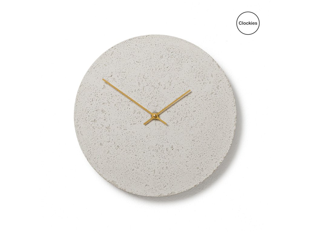 Ceas de perete alb, rotund cu acele indicatoare aurii din aluminiu eloxat.