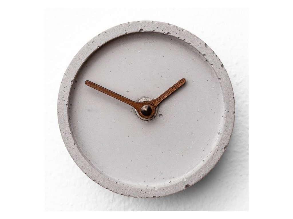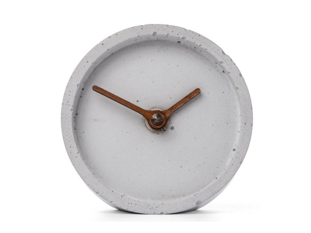 Ceas de masă gri, rotund cu acele indicatoare din lemn de nuc.