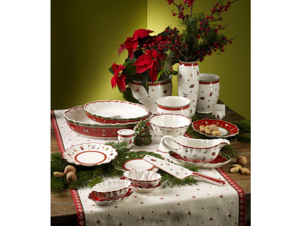 Colecția Toy's Delight de la compania germană Villeroy&Boch este esența Crăciunului și a atmosferei de Crăciun, pe care designerii le-au împletit literalmente în toate cele trei produse frumoase de care colecția este mândră. Ce ar putea evoca mai mult timpul Crăciunului decât un brad împodobit, plin de lumini, pe care cad încet fulgi de zăpadă albi? Puteți găsi acest motiv și alte motive pe suporturi de farfurie unice, realizate din 70% bumbac, în două variante de culoare - alb-roșu și roșu-verde - sau pe materialul pentru șervete de bucătărie, cu ajutorul cărora veți obține la masă o notă festivă fermecătoare, datorită căreia vă veți bucura de o cină de Crăciun în familie la o masă decorată magic.