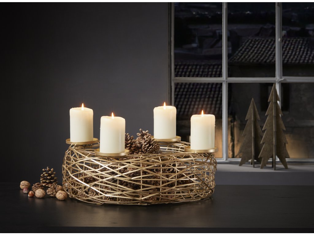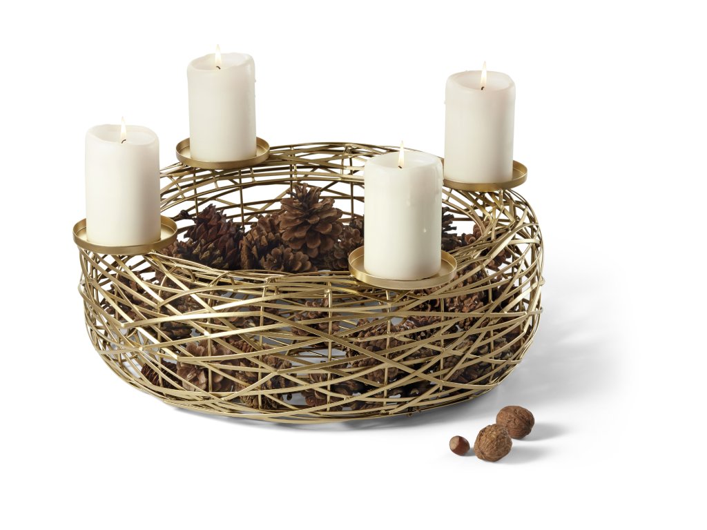 Eleganta coroană aurie de Advent seamănă cu un cuib țesut, în care puteți așeza cu ușurință lumânări sau decorațiuni de Crăciun. Disponibilă în două dimensiuni (Ø 39,5 cm și Ø 54 cm), va ieși în evidență atât individual, cât și în combinație.