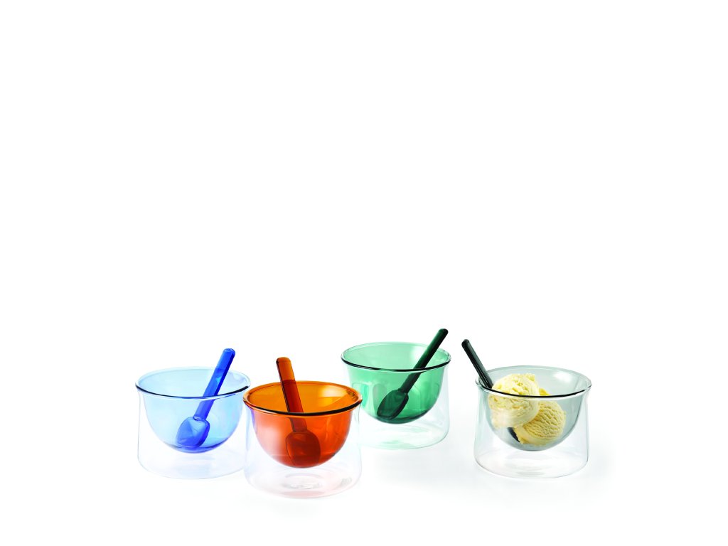 Setul GELATO va aduce culori, ușurință și o atmosferă estivală pe masa dumneavoastră. Paharele din sticlă colorată, suflate manual, cu pereți dubli, mențin înghețata rece mai mult timp și, datorită aspectului lor aerisit, creează un efect fermecător de „levitație” al servirii.