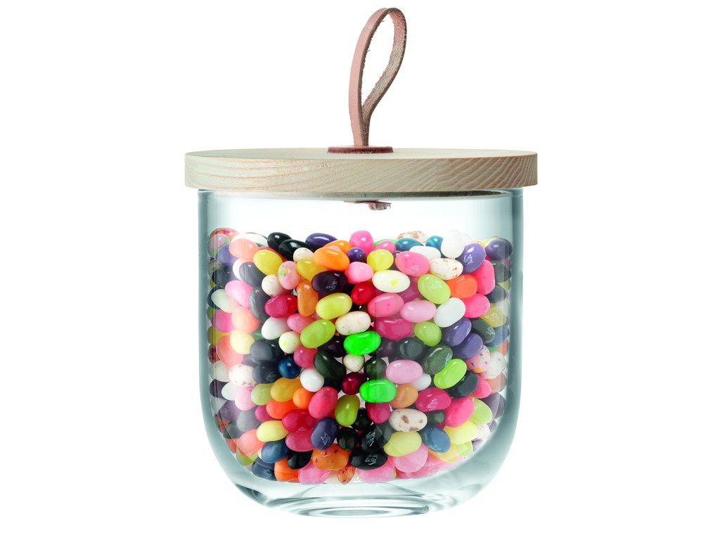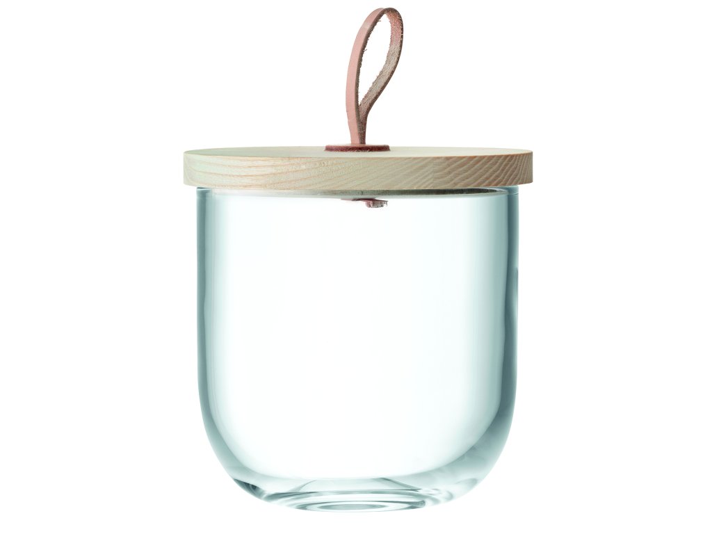 Liniile minimaliste ale recipientului din sticlă în combinație cu capacul din lemn de frasin și cu curelușa din piele conferă colecției Ivalo un aspect caracteristic. Sticla suflată manual cu o suprafață netedă, pielea netradițională și lemnul, al cărui desen amintește un câmp de porumb, creează un contrast, care arată foarte armonios. Cutiile cu capace din lemn pot fi folosite nu numai în bucătărie, ci și în baie pentru depozitarea tampoanelor de bumbac, etc. Toate produsele sunt ambalate în cutii pentru cadouri. Mărimi: înălțime 15,5 cm, diametru 15 cm.
