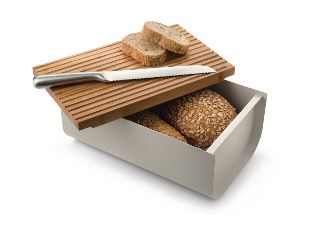 Noua cutie pentru pâine Mattina de la Alessi a fost concepută pentru a vă menține pâinea și alte produse de patiserie proaspete pentru mai mult timp. Cutia fabricată din oțel este, de asemenea, echipată cu un capac robust din bambus, care poate fi folosit ca tocător, practic pentru feliere și servire.