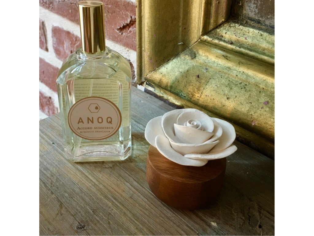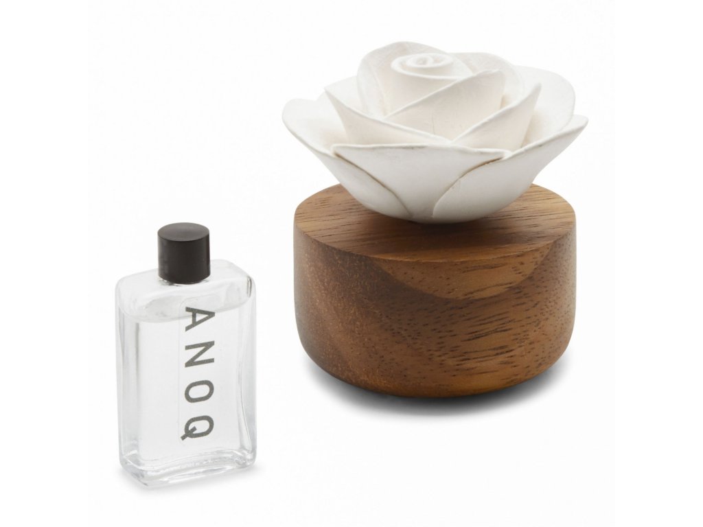 ANOQ este un brand francez de difuzoare de lux care sunt realizate din lemn de salcâm și ceramică poroasă. Fiecare produs este decorat cu o floare originală, pe care trebuie doar să aplicați câteva picături din uleiul esențial preferat. Puteți alege dintr-o gamă largă de flori și culori. Doar adăugați 2-3 picături de ulei esențial pe floare și îl așezați în cameră.