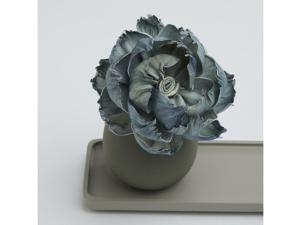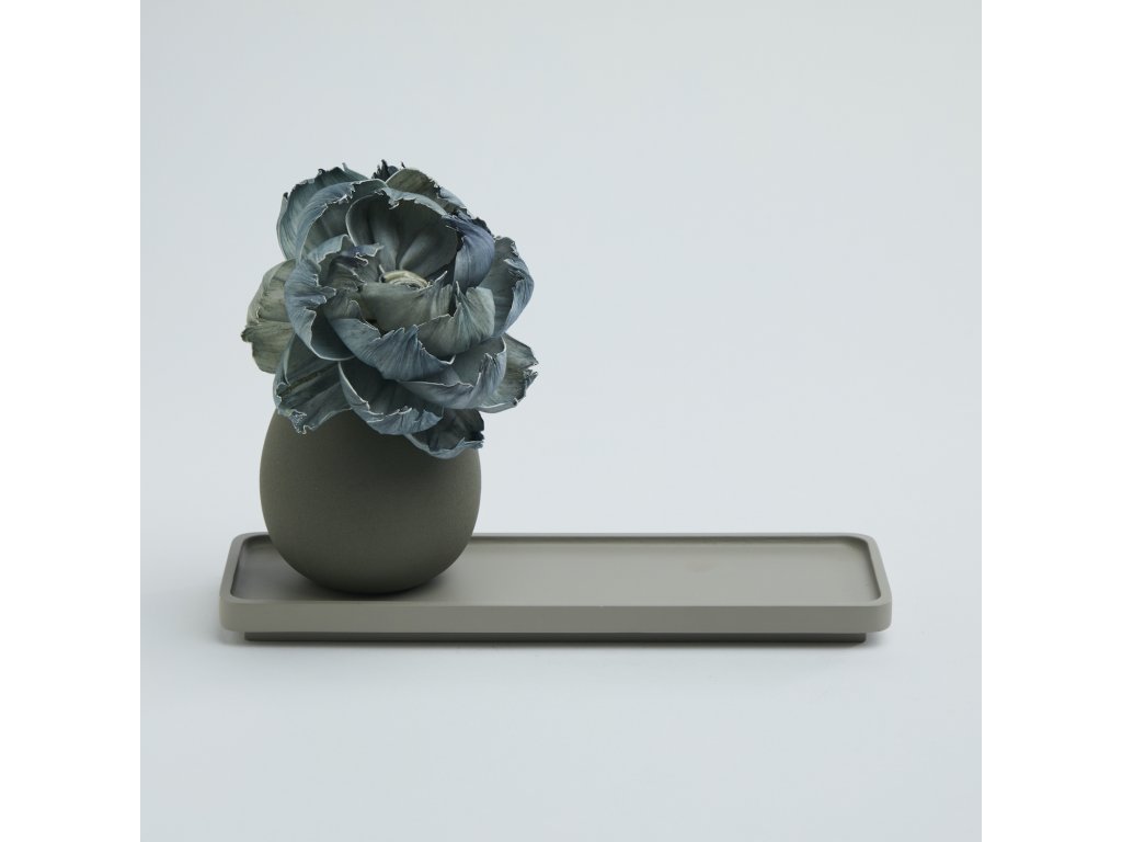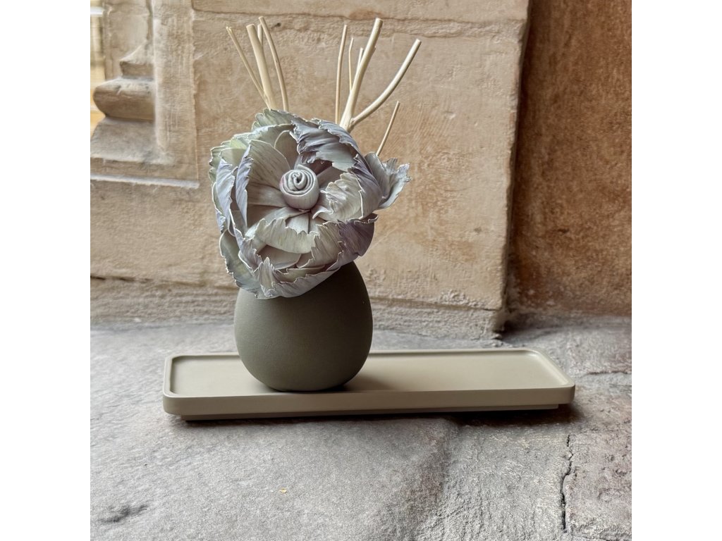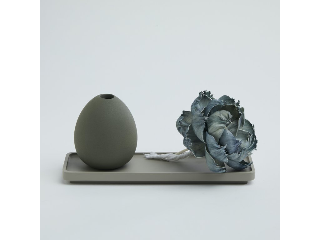 Setul include o tavă dreptunghiulară din lemn într-o nuanță sofisticată de taupe, o vază ceramică verde închis în formă de ou și o floare solo delicată care difuzează parfumul în mod natural și sensibil în spațiu. Întregul arată armonios și, în același timp, distinctiv - ca un detaliu care ridică subtil interiorul.