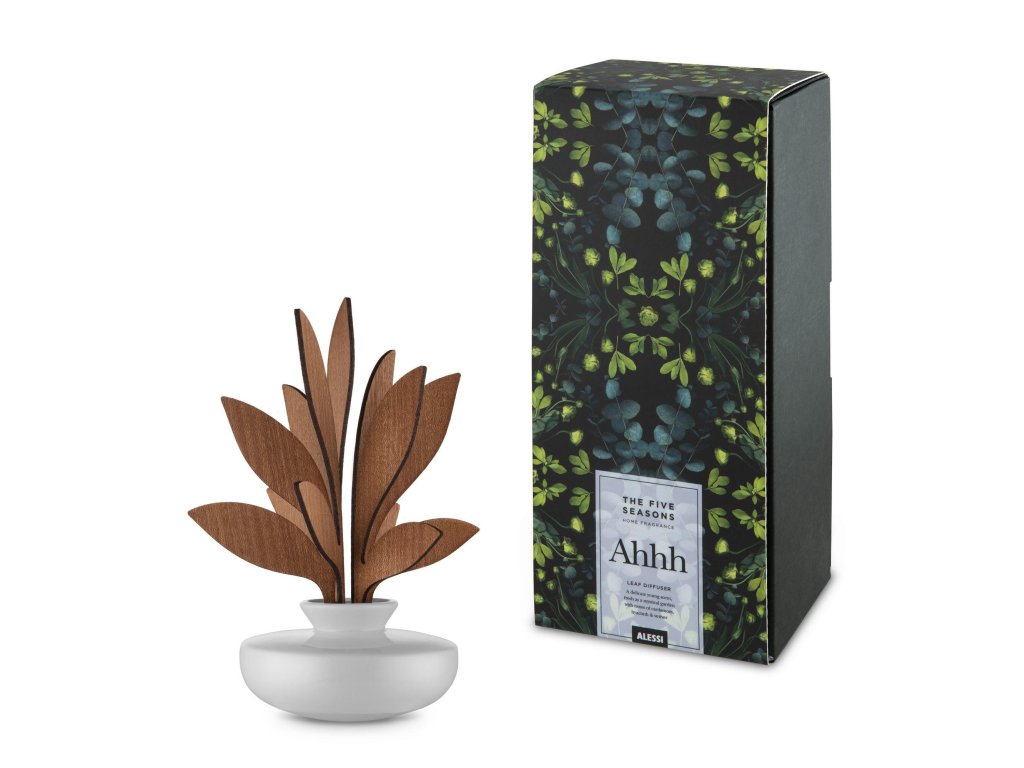Marcel Wanders a creat pentru marca italiană de accesorii premium Alessi o colecție unică de articole "The Five Seasons" pentru parfumarea casei. Difuzorul este realizat din lemn de mahon și are forma unor crenguțe cu frunze. Astfel formează un accesoriu de design unic în sine. Crenguțele din lemn sunt așezate într-un recipient elegant și minimalist din porțelan alb. Difuzorul îți parfumează interiorul cu parfumul Ahhh, care este unul dintre mai multe parfumuri unice din colecție și reprezintă schimbările ciclice în viața tuturor. După cum sugerează și numele, este un parfum spumant și proaspăt. În parfum veți recunoaște tonurile de cardamom, zambilă și vetiver. Este perfect pentru iubitorii de parfumuri răcoritoare; vei începe ziua perfect și vă va trezi toate simțurile. Recipientul împreună cu crenguțele au 21,5 cm înălțime, măsoară 11,5 cm în diametru și puteți cumpăra o rezervă pentru difuzor în orice moment. Lasă-te îmbătat de mirosurile uimitoare de la Alessi; puteți suplimenta difuzorul cu lumânări din aceeași colecție.