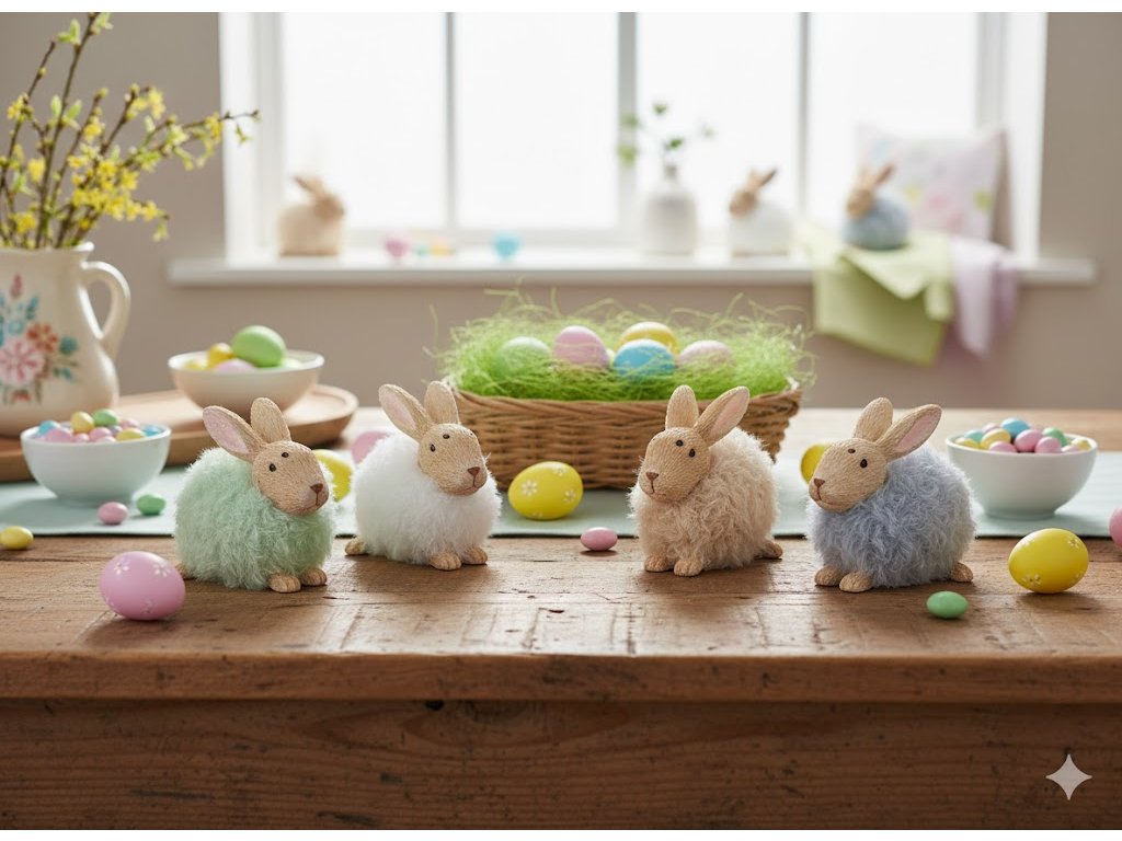De asemenea, oferim iepurași agățați pe crenguțe în aceleași culori.