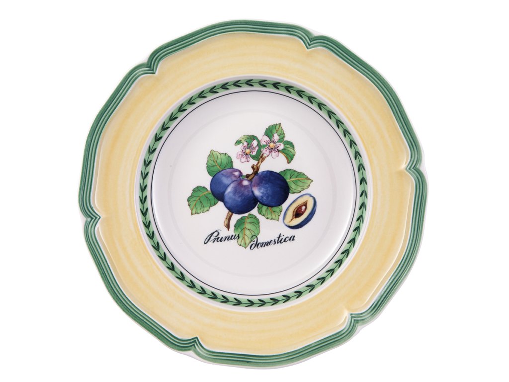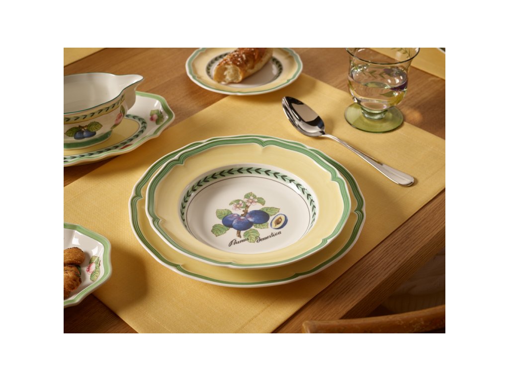 Lăsați-vă îmbătați de gustul fructelor coapte, care sunt motivul colecției French Garden Valence de la renumita marcă Villeroy & Boch. Motivele tradiționale ale vieții de la țară sunt reflectate pe porțelan de calitate premium și astfel va decora casa dvs. Motivul fructelor este combinat cu o culoare galbenă proaspătă, linii verzi și un decor rustic. Acest model natural va impresiona toți fanii unui stil simplu, dar și jucăuș.