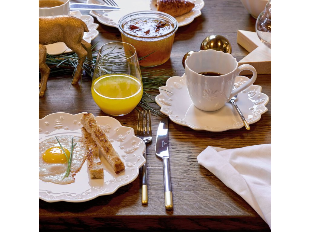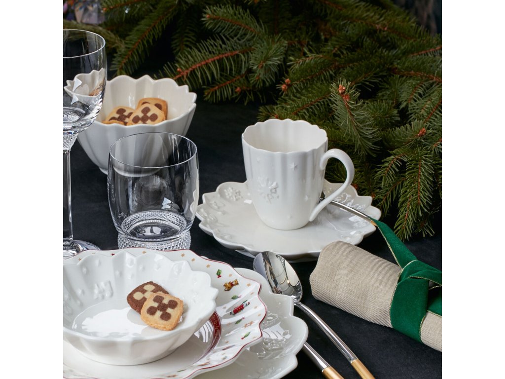 În plus, colecția albă este uimitor de practică, deoarece datorită simplității sale de culoare, poate fi ușor combinată cu alte tipuri de vase. Datorită conceptului fermecător de design delicat, este destinat să servească cina de Crăciun, în timpul căreia va evoca cu gust și discreție o atmosferă relaxată de Crăciun. Folosiți-l ca un cadou original care îi va face fericiți pe cei din familie sau pe prieteni.