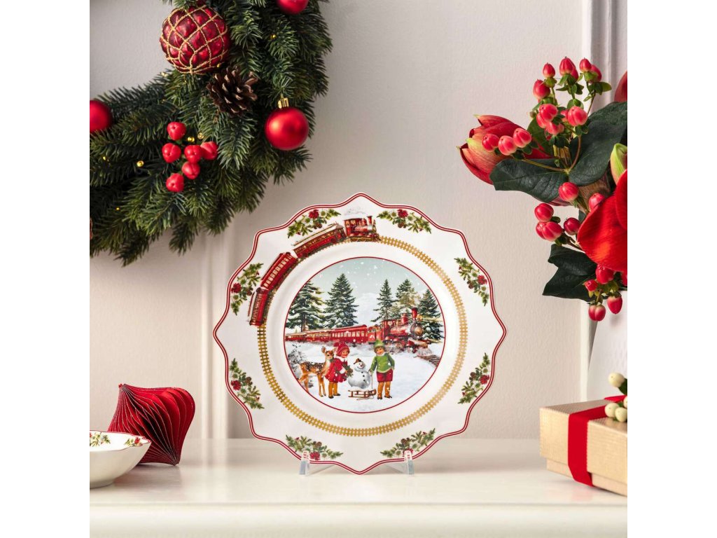 Începeți Adventul acestui an cu ediția limitată Ediția Anuală de Crăciun 2025 , care va încânta fiecare iubitor al Crăciunului tradițional. Farfuria de desert cu o margine ușor ondulată și linii roșii este decorată cu un motiv nostalgic de peisaj de iarnă - copii construind un om de zăpadă, căsuțe acoperite de zăpadă și Polar Express care trece prin peisaj . Șinele decorate cu aur conferă întregii scene o notă specială și fac din farfurie o piesă de colecție cu adevărată magie de Crăciun.