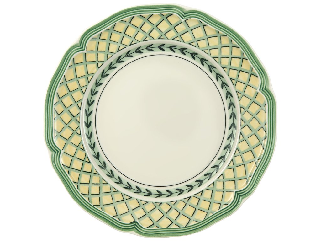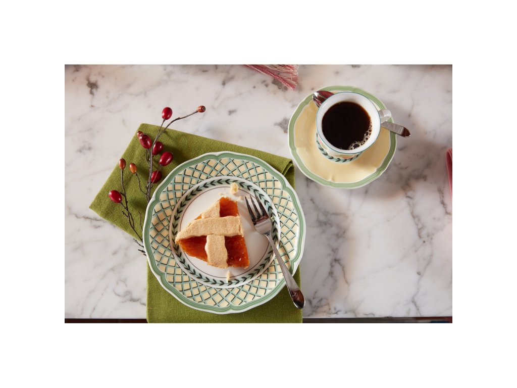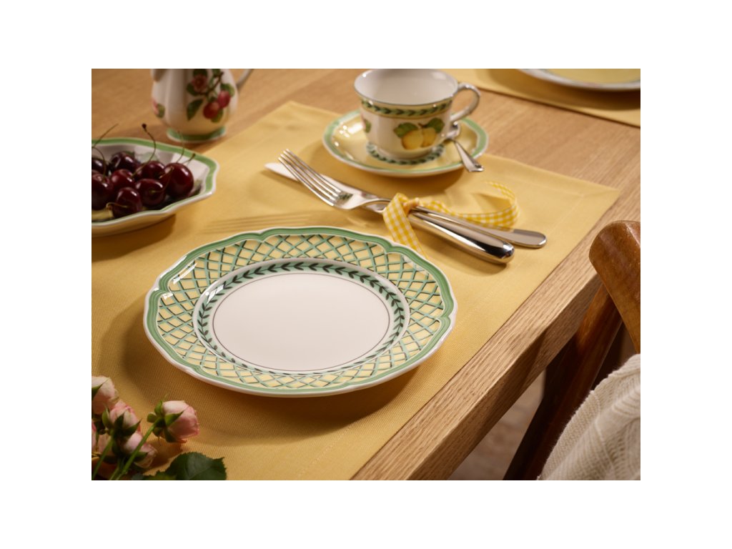 Nu numai o briză proaspătă, dar în special culori proaspete în nuanțe de galben și verde sunt aduse de această colecție uimitoare French Garden Orange de la marca Villeroy & Boch. Transferați-vă pentru un moment sub umbra copacilor, într-o grădină de sat francez. Viața de la sat a servit drept inspirație pentru acest serviciu de masă (farfurie plată, adâncă, farfurie pentru desert și farfurie pentru pâine și unt).