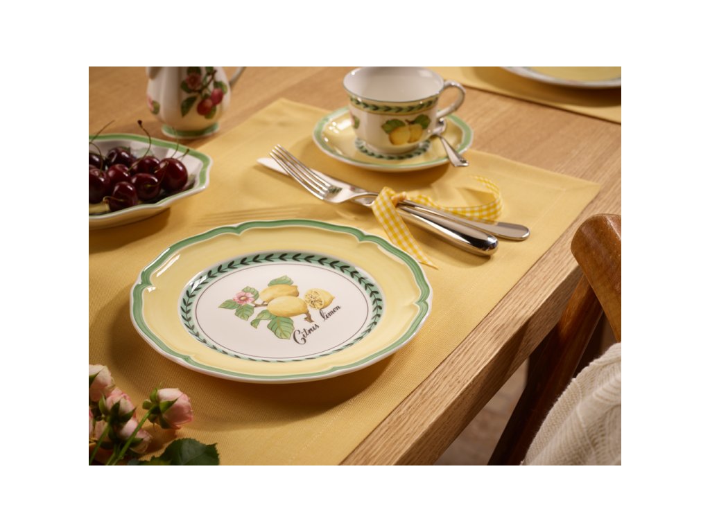 Lăsați-vă îmbătați de gustul fructelor coapte, care sunt motivul colecției French Garden Valence de la renumita marcă Villeroy & Boch. Motivele tradiționale ale vieții de la țară sunt reflectate pe porțelan de calitate premium și astfel va decora casa dvs. Motivul fructelor este combinat cu o culoare galbenă proaspătă, linii verzi și un decor rustic. Acest model natural va impresiona toți fanii unui stil simplu, dar și jucăuș.