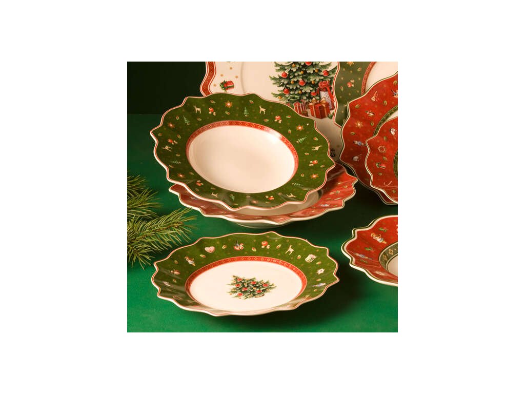 Colecția Toy's Delight de la compania germană Villeroy&Boch este esența Crăciunului și a atmosferei de Crăciun, pe care designerii le-au împletit literalmente în toate cele trei produse frumoase de care colecția este mândră. Ce ar putea evoca mai mult timpul Crăciunului decât un brad împodobit, plin de lumini, pe care cad încet fulgi de zăpadă albi? Puteți găsi acest motiv și alte motive pe suporturi de farfurie unice, realizate din 70% bumbac, în două variante de culoare - alb-roșu și roșu-verde - sau pe materialul pentru șervete de bucătărie, cu ajutorul cărora veți obține la masă o notă festivă fermecătoare, datorită căreia vă veți bucura de o cină de Crăciun în familie la o masă decorată magic.