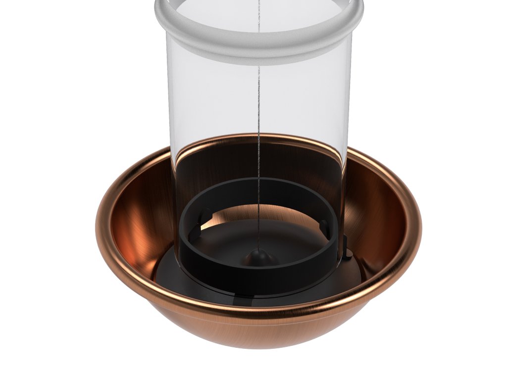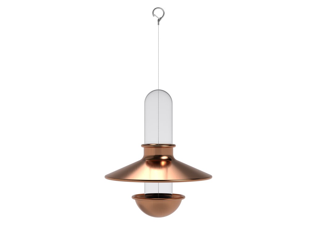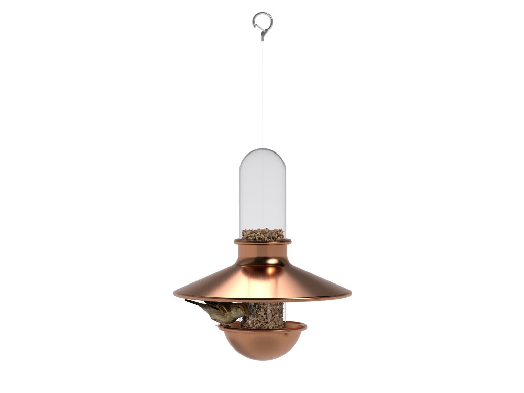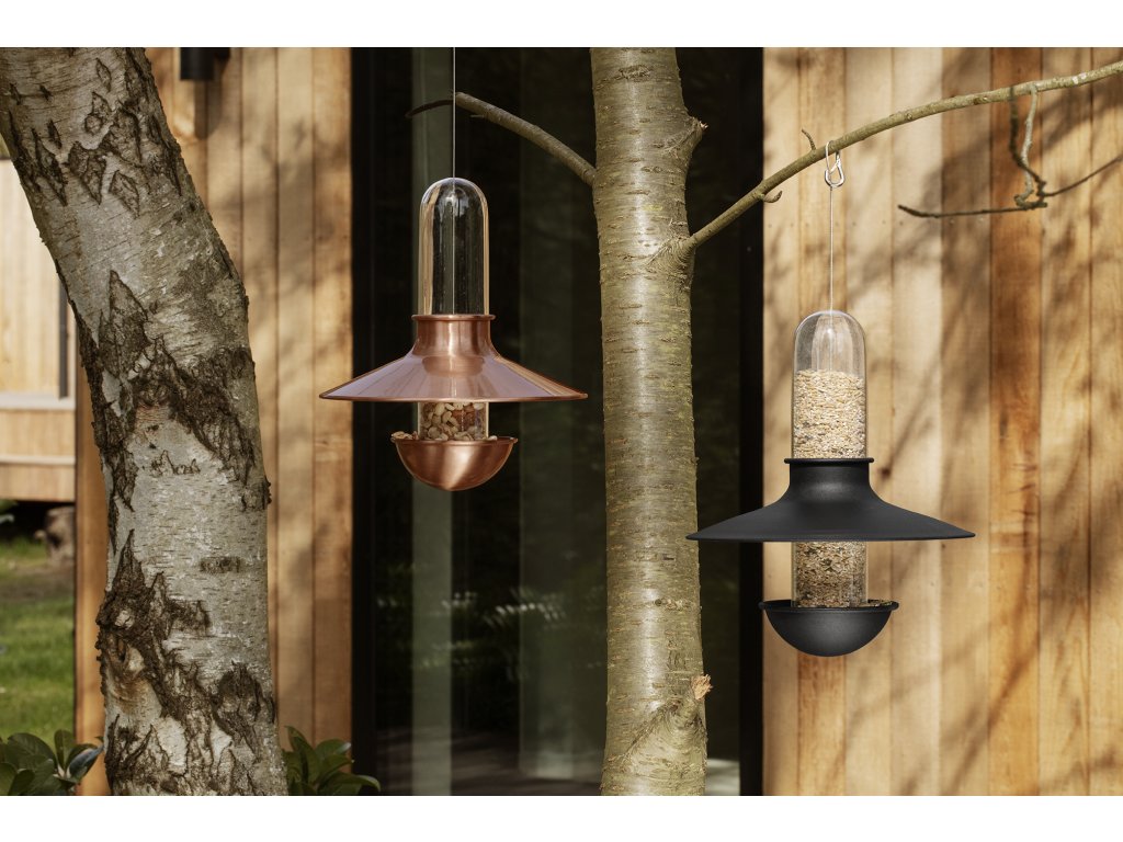 Hrănitorul funcțional de la Eva Solo vă va ajuta să hrăniți păsările care stau cu noi peste iarnă. Agățați hrănitorul de design De Luxe în grădină. Va încuraja vizitele păsărilor mici care pot ateriza cu ușurință pe marginea de oțel a hrănitorului. "Pălăria" mare asigură că păsările mai mari nu pot ajunge la el. Hrănitorul este ușor de umplut. Este realizat din oțel inoxidabil. Partea din sticlă poate fi spălată în mașina de spălat vase. Disponibil în culorile negru sau arămiu.