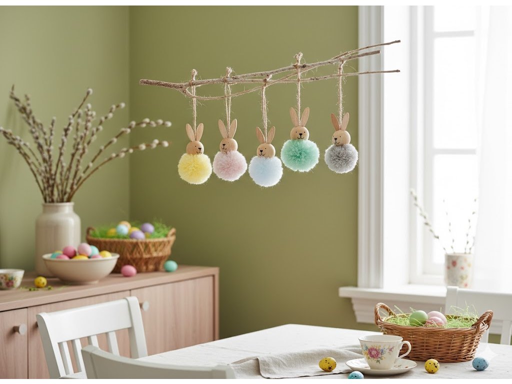 De asemenea, oferim iepurași agățați pe crenguțe în aceleași culori.