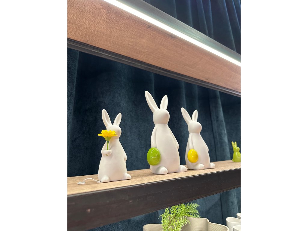 În același stil, puteți obține doi iepurași mai mici de 8 cm cu suporturi pentru ouă, precum și iepurași decorativi mai mari, în trei dimensiuni - care țin un ou sau o floare de primăvară. Toate figurinele sunt realizate din porțelan alb de înaltă calitate și sunt decorate cu o suprafață elegantă și netedă - iepurașii nu au niciun model.