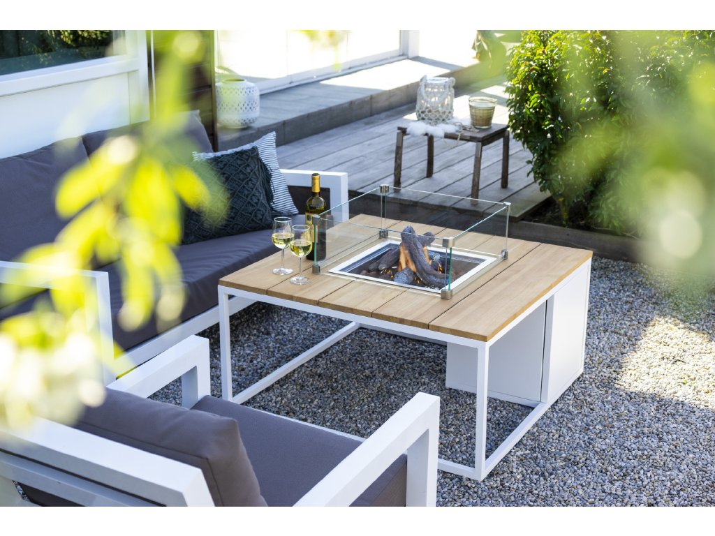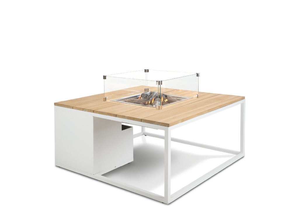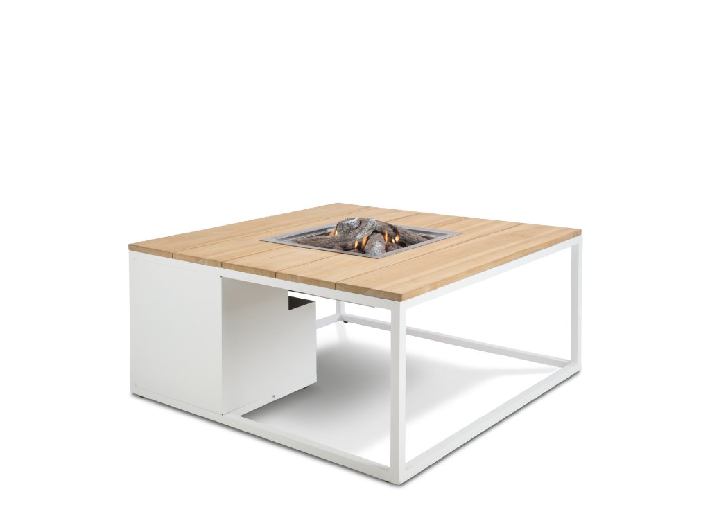 Masă cu șemineu pe gaz COSI - tip Cosiloft 100, cadru alb / blat din lemn de tec