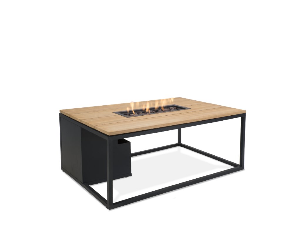 Masă cu șemineu pe gaz COSI - tip Cosiloft 120, cadru negru / blat din lemn de tec