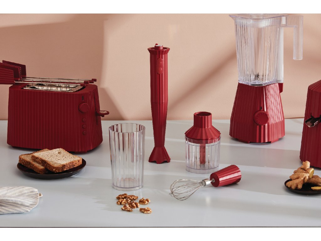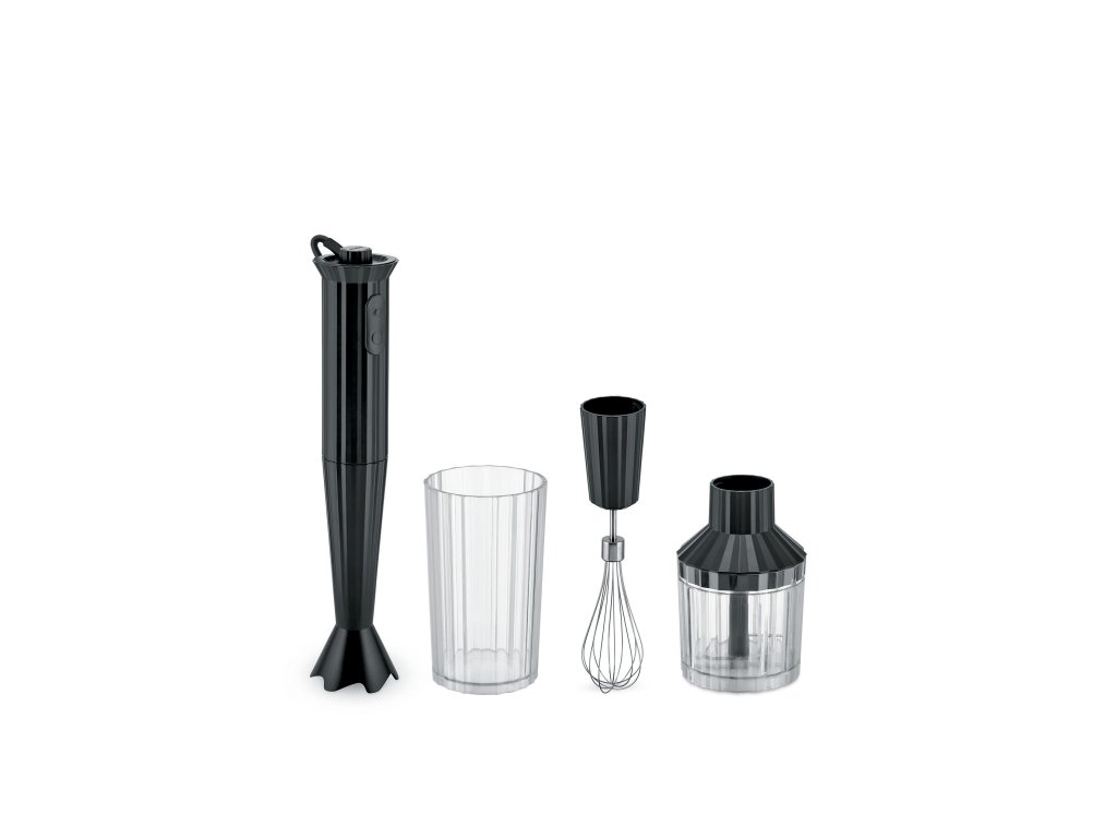 Celebrul designer italian Michele de Lucchi a proiectat acest mixer de design Plissé pentru marca italiană de accesorii premium Alessi. La prima vedere, vecți fi atrași de suprafață ondulă a aparatura, ducă câreia mixerul și-a primit numele. Datorită micilor striații, mixerul arată elegant și stilat. Ați fi fericiți să-l lățăți pe blatul de cucăciți, unde va face o sămășă grozav. Cu ajutorul mixerului Plissé poti prepara delicioase supa crema, sosuri sau piure din fructe si cu ajutorul accesoriilor din set, chiar si sos hollandez sau nuci tocate. Este disponibil în patru variante de culoare: negru, gri, rojo și alb. Culorile însoțesc întreaga colecție Plissé, astfel încât să fie posibilă dotarea bucătăriei cu acest aparat de design elegant și să le potriți ton cu ton. Mixerul are 34 cm lungime, o putere de 500 wați și un recipient cu un volum de 800 ml și 400 ml.
