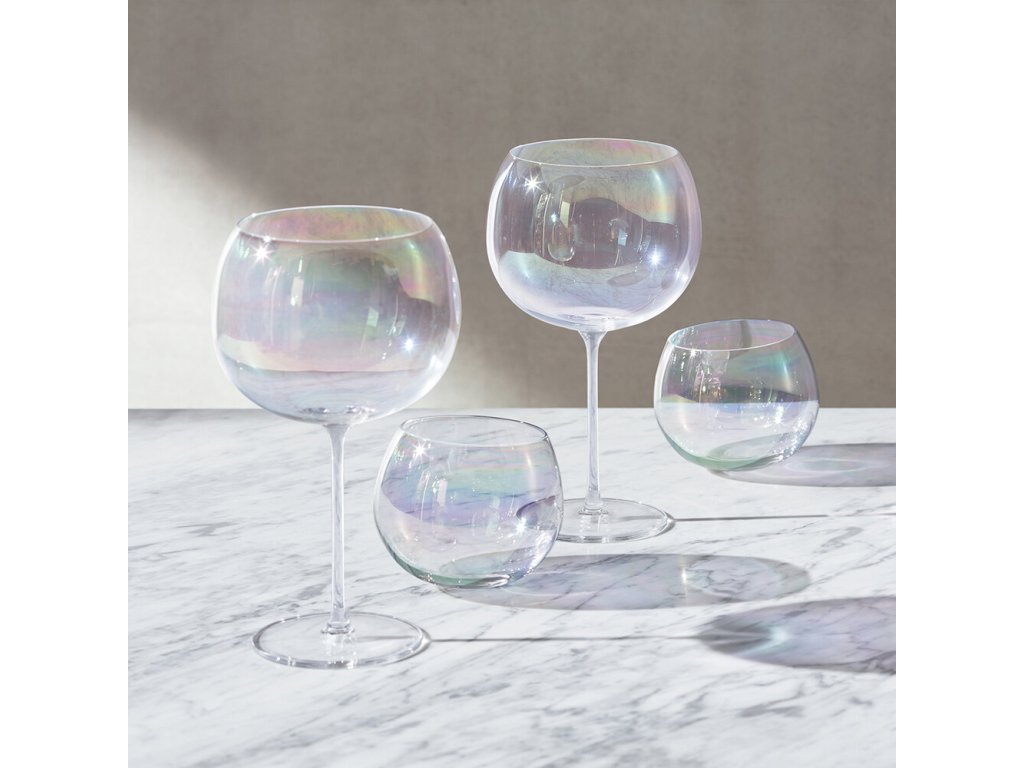 Set de patru pahare moderne în formă de balon, pictate manual, cu un luciu sidefat, inspirate de forme, suprafețe irizate și mișcarea bulelor. Baza rotundă permite paharului să se balanseze ușor. Paharul este potrivit pentru cocktailuri, vin sau apă.