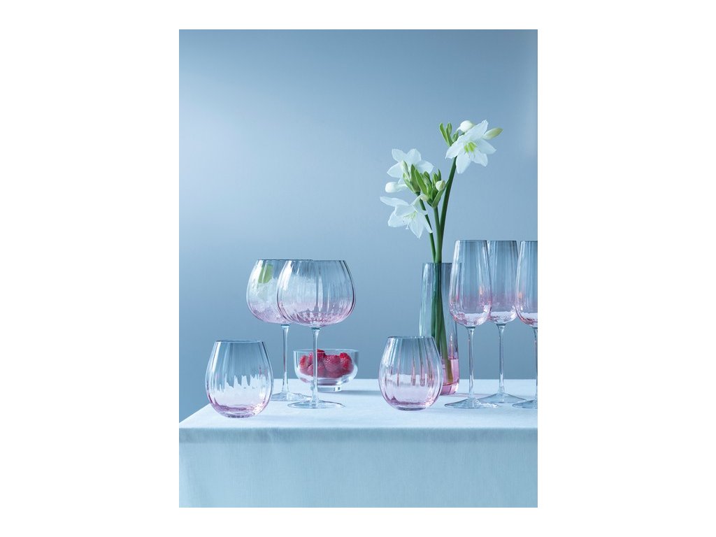 Paharele sunt în mod tradițional fabricate din sticlă suflată. Decorate manual cu culori metalice lucioase. Suprafața ușor ondulată accentuează culoarea irizată a paharelor. Combinația roz-gri oferă sticlei o notă neobișnuită. Disponibile în două variante de culoare, într-un set de două bucăți. Datorită producției realizate manual, dimensiunea produselor individuale poate varia ușor.