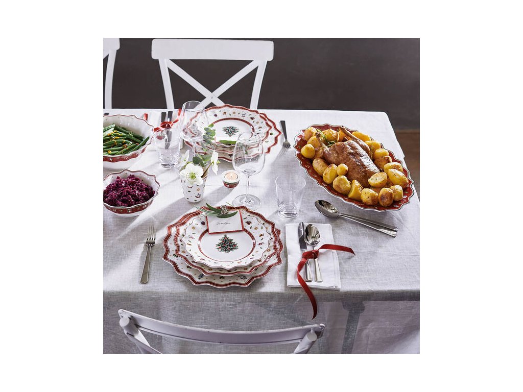 Colecția Toy's Delight de la compania germană Villeroy&Boch este esența Crăciunului și a atmosferei de Crăciun, pe care designerii le-au împletit literalmente în toate cele trei produse frumoase de care colecția este mândră. Ce ar putea evoca mai mult timpul Crăciunului decât un brad împodobit, plin de lumini, pe care cad încet fulgi de zăpadă albi? Puteți găsi acest motiv și alte motive pe suporturi de farfurie unice, realizate din 70% bumbac, în două variante de culoare - alb-roșu și roșu-verde - sau pe materialul pentru șervete de bucătărie, cu ajutorul cărora veți obține la masă o notă festivă fermecătoare, datorită căreia vă veți bucura de o cină de Crăciun în familie la o masă decorată magic.