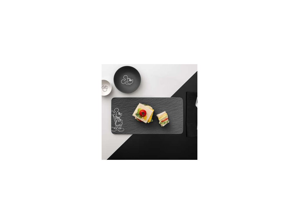 Porțelanul mat, cu structura sa caracteristică inspirată de ardezia naturală, creează un contrast izbitor cu motivul subtil și minimalist al lui Mickey. Versiunea neagră sau albă subliniază puritatea grafică a întregii colecții și îi conferă o notă contemporană, ușor urbană.