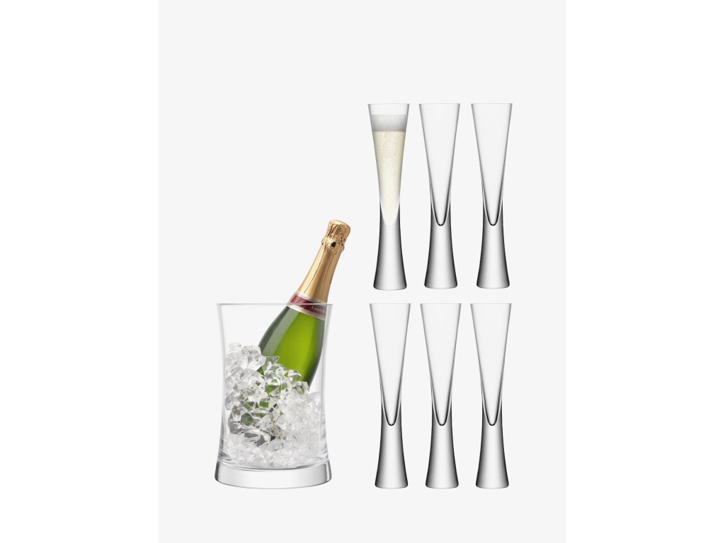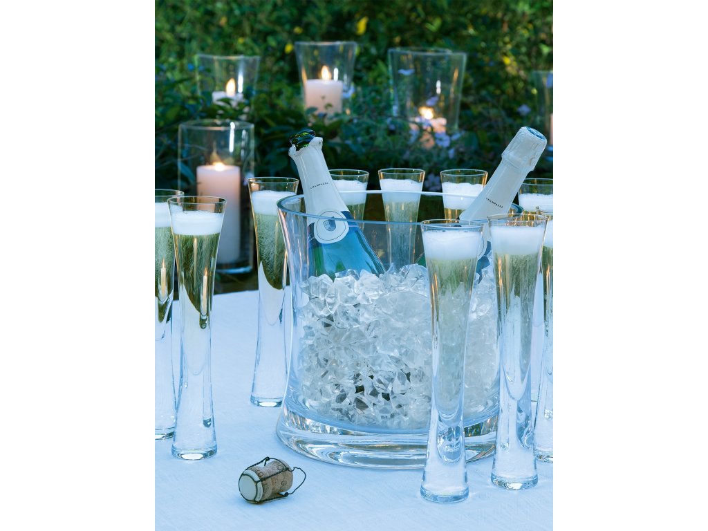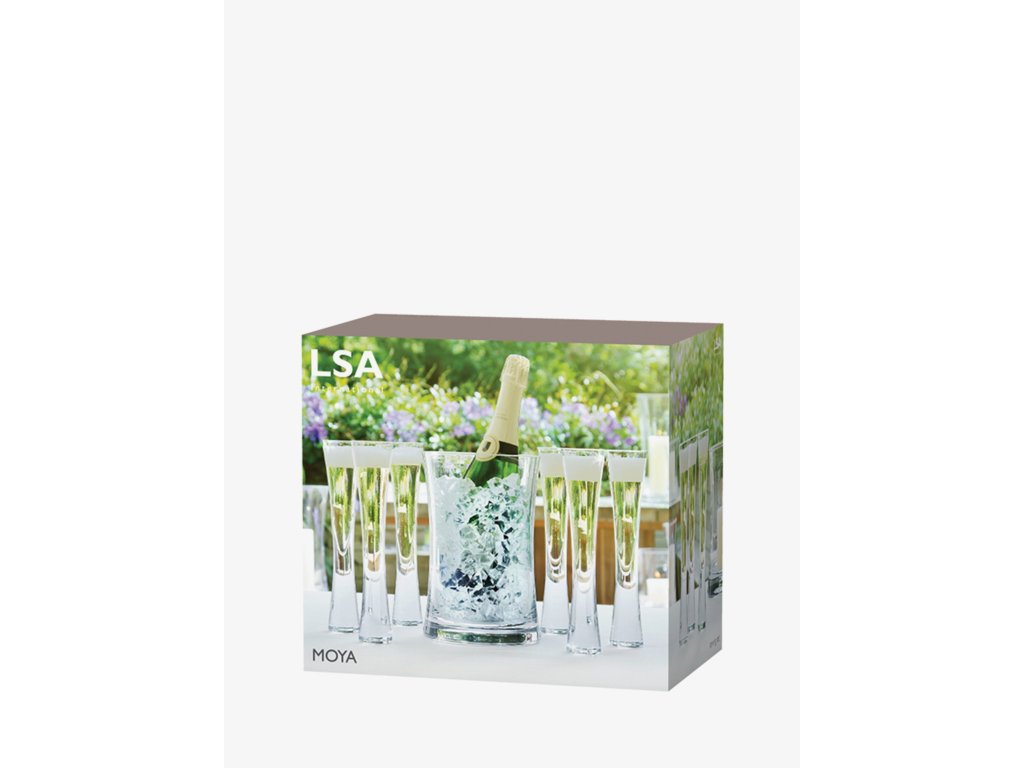 Turnarea șampaniei este asociată cu ocazii speciale, cum ar fi nunți și petreceri de zile de naștere. Ar trebui să savurăm vinul spumant în mod corespunzător imediat după deschidere și turnarea sa peste marginea unui pahar mai înalt. Paharele lungi, în formă de flaut sunt ideale pentru a ne bucura ochii cu frumoasele mărgele de bule. Spre deosebire de clasicele pahare înguste, aceste pahare de la LSA din colecția Moya au gâtul ușor lărgit, iar datorită acestui lucru vă veți bucura și de aroma șampaniei, care se dezvoltă frumos. Paharele sunt lucrate manual, din sticlă suflată. Setul de șase pahare este completat de o găleată pentru gheață și răcit sticle.