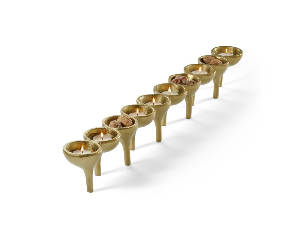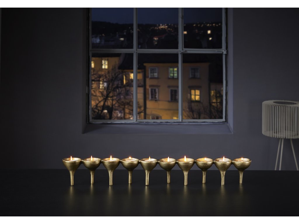 Zece cești tip lumânare tip pastilă, așezate pe picioare elegante, creează un joc impresionant de lumini și umbre, amintind de liniștea nopților nordice. Fabricată din metal într-o nuanță aurie mată, arată luxos și atemporal. Datorită lungimii sale, va deveni piesa centrală perfectă a unei mese aranjate festiv, o decorațiune pentru o comodă și un accesoriu atmosferic pe pervazul unei ferestre.