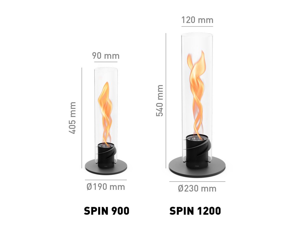 Șemineul cu alcool de masă Höfats Spin este disponibil în trei dimensiuni. SPIN 900 - cu diametrul cilindrului de sticlă de 90 mm , SPIN 1200 - cu un diametru al cilindrului de sticlă de 120 mm și SPIN 1500 - cu un diametru al cilindrului de sticlă de 150 mm . În două versiuni mai mici, bioșemineele SPIN sunt disponibile în patru culori (gri, negru, argintiu și auriu). Cel mai înalt biosemineu SPIN 1500 este disponibil în finisaje argintiu și negru.