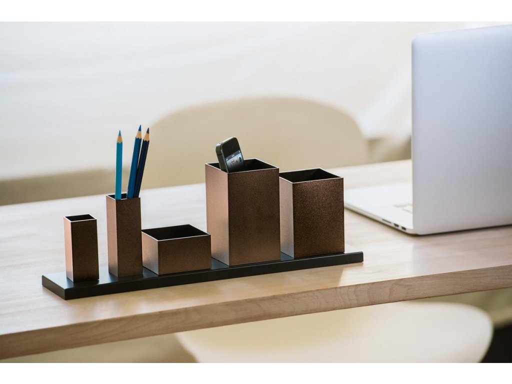 Pentru că oricărui birou îi stă bine cu o bună organizare a lucrurilor, THEO a preluat sarcina de a asigura tot ce este necesar pentru aceasta. În cutii maro anodizate își vor găsi locul toate rechizitele necesare, la fel ca și ochelarii sau alte mărunțișuri de birou. CLOU este banda magnetică care menține cutiile în poziția dorită astfel încât biroul dumneavoastră să fie perfect organizat zi de zi.