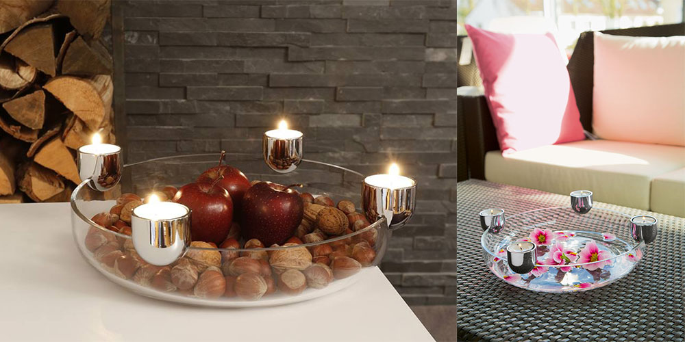 Suportul de sticlă Philippi Arena cu vas pentru apă sau esențe aromatice reprezintă unul dintre cele mai populare obiecte decorative. Pentru realizarea unui efect deosebit puteți să îl împodobiți cu flori plutitoare.
