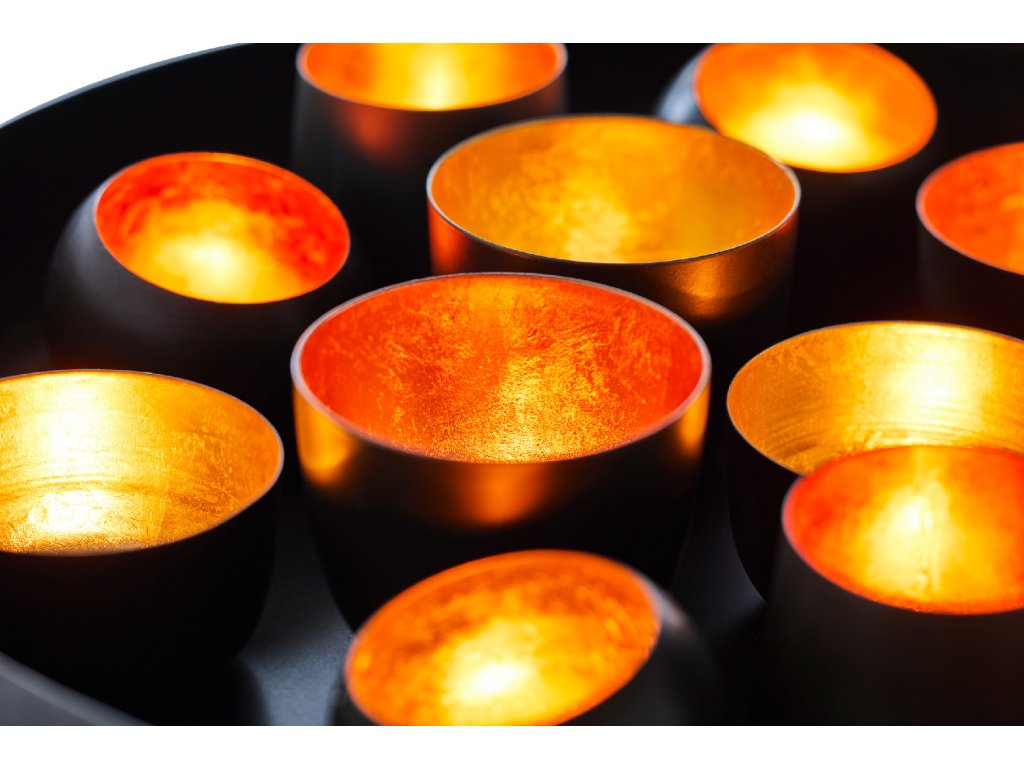 Descoperiți frumusețea luminii și a umbrelor! Descoperiți tava Santa Lucia, care are un spațiu generos pentru până la 12 lumânări. Focuri de artificii din frunze aurii și arămii vă vor lumina masa! Este un spectacol captivant cu promisiunea unor seri romantice, de asemenea, un cadou grozav pentru dvs. sau pentru cei dragi. Flăcările lumânărilor creează momente magice. Mai multe lumânări vor adăuga o atmosferă mai profundă. Și cea mai importantă este funcția universală a acestei tăvi din metal. Tava poate fi decorată creativ cu diverse flori uscate sau nuci mari în coajă. Aprindeți scânteia dragostei cu Santa Lucia! Pe scurt, Santa Lucia este cadoul perfect pentru dumneavoastră sau pentru cei dragi!