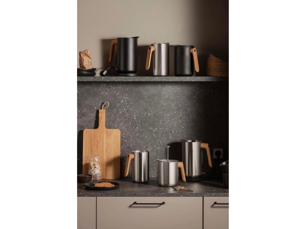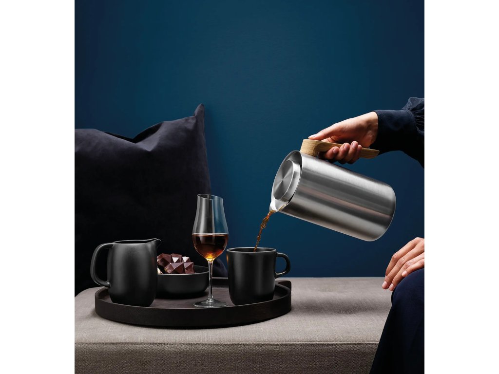 Combinația elegantă dintre corpul negru mat și mânerul din lemn de stejar îl transformă într-o adevărată piesă de design care va decora orice masă. Peretele dublu cu insert vidat menține cafeaua sau ceaiul cald timp de ore întregi. Datorită capacului practic cu mecanism de turnare, este ușor de utilizat cu o singură mână.