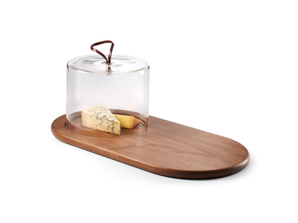 Lemn de nuc, capac de sticlă și piele. Acestea sunt elementele care vor crea o servire elegantă pe masă. Tocătorul pentru servit are 40 cm și puteți așeza confortabil și alte delicatese pe el. Capacul protejează preparatele delicioase nu numai de insecte, ci păstrează mai bine și aroma mai pronunțată a brânzeturilor delicioase.