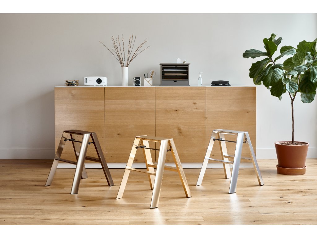 Trepte din aluminiu super stilate în culori elegante de la Metaphys. Scările pliabile sunt ușor de depozitat. Când sunt închise, ocupă doar 15,5 cm și cântăresc doar 4 kg! Când sunt desfăcute, asigură stabilitate 100% datorită robusteții lor. Marginile rotunjite și senzația satinată a suprafeței adaugă un sentiment extraordinar de lux. Premii primite: Red Dot Design, Good Design și JIDA Design Museum Selection Awards.