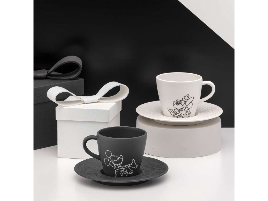Porțelanul mat, cu structura sa caracteristică inspirată de ardezia naturală, creează un contrast izbitor cu motivul subtil și minimalist al lui Mickey. Versiunea neagră sau albă subliniază puritatea grafică a întregii colecții și îi conferă o notă contemporană, ușor urbană.
