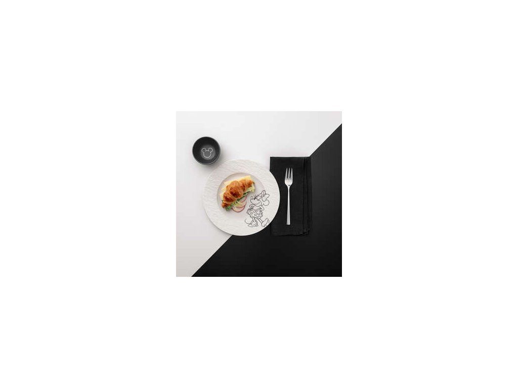Porțelanul mat, cu structura sa caracteristică inspirată de ardezia naturală, creează un contrast izbitor cu motivul subtil și minimalist al lui Mickey. Versiunea neagră sau albă subliniază puritatea grafică a întregii colecții și îi conferă o notă contemporană, ușor urbană.